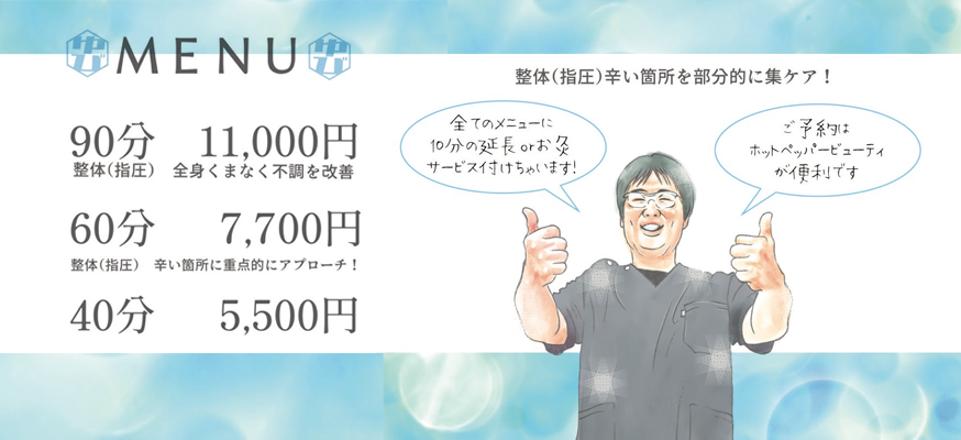 | 90分コース 整体(指圧) 「全身くまなく不調を改善!」 | ¥ 11,000 |